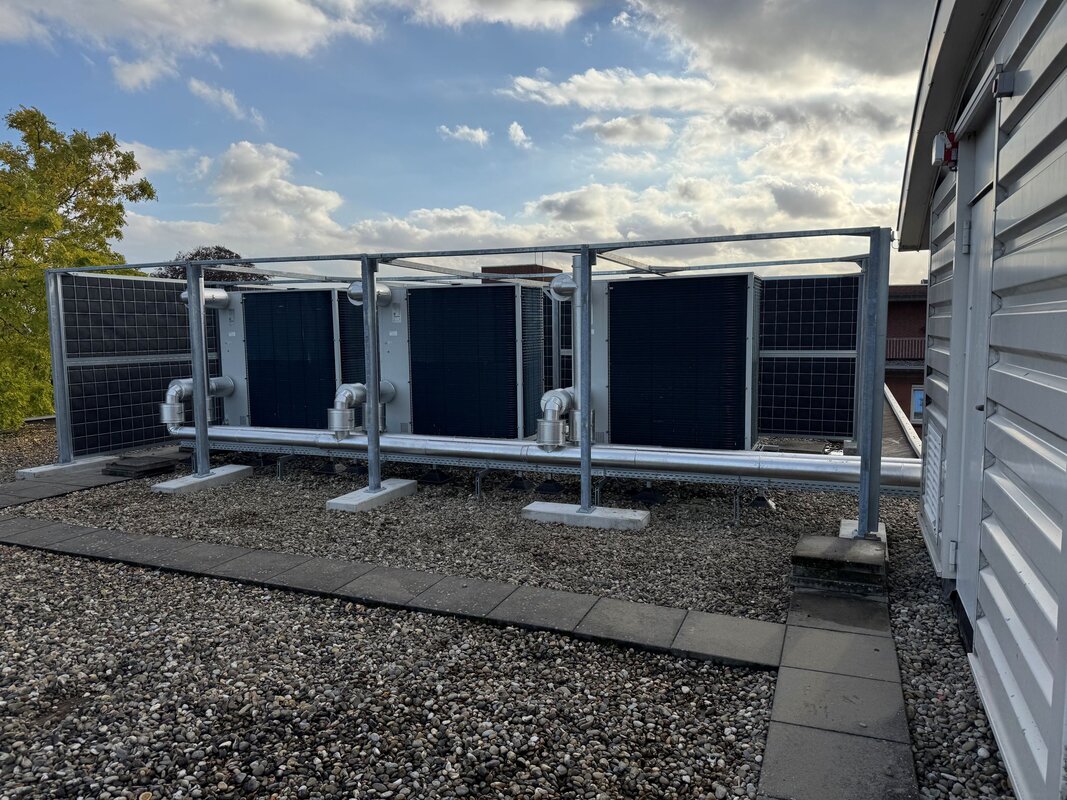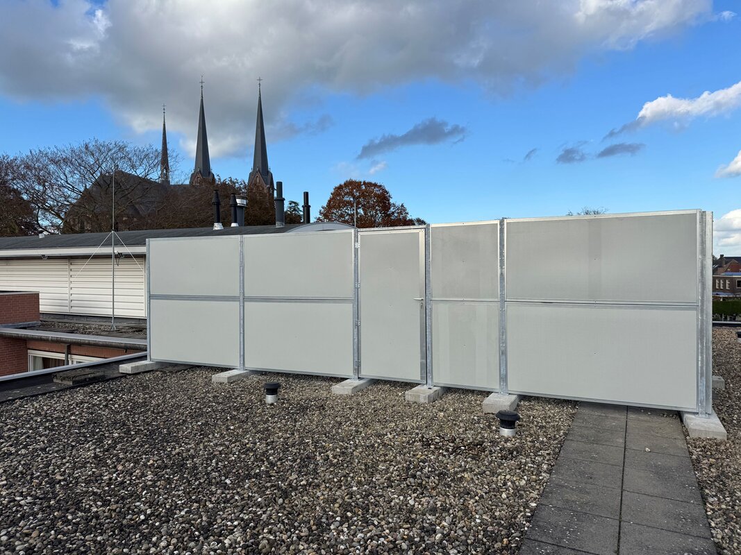ieder dak en iedere samenstelling van installaties een passende en effectieve oplossing. ‘Aan de basis van de geluidsschermen ligt steevast een verzinkt of gepoedercoat stalen constructie, waartussen kant-en-klare panelen worden aangebracht. De geluidsschermen zijn aan één of beide zijden voorzien van een laag absorberende minerale wol, afgewerkt met meerdere gaaslagen. Deze kant-en-klare panelen vormen een ideaal geluidsscherm voor afscherming van geluid van machines, airco’s en kunnen optioneel worden begroeid met klimplanten! Naar wens zijn bovendien verschillende kleuren, zinken felsplaten, golfplaten en damwandprofielplaten leverbaar, materialen die ook worden