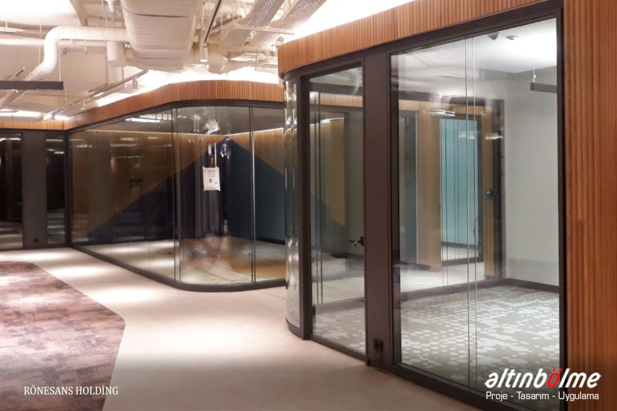Alnoplan G100 system is a 100 mm thick, vertical non- profile, double-glazed, glass-to-glass partition wall system. High sound insulation is provided with 10-10 mm tempered glasses. There are no vertical carrier and glass profiles between the glasses.A thin transparent polycarbonate lath with 3M adhesive tape on both sides or thin aluminum lath is used between the glasses, so that the environments are transparent, fully open to daylight and provide integrity in the workplace.