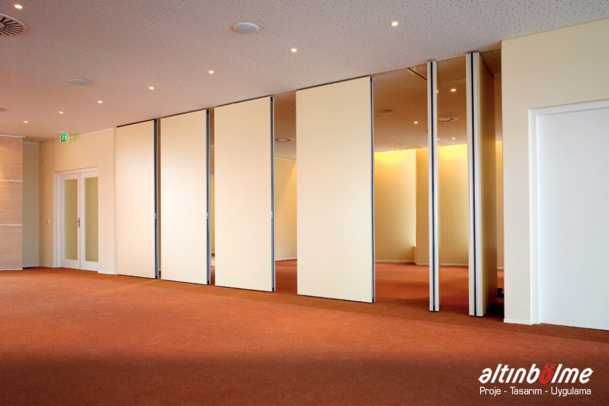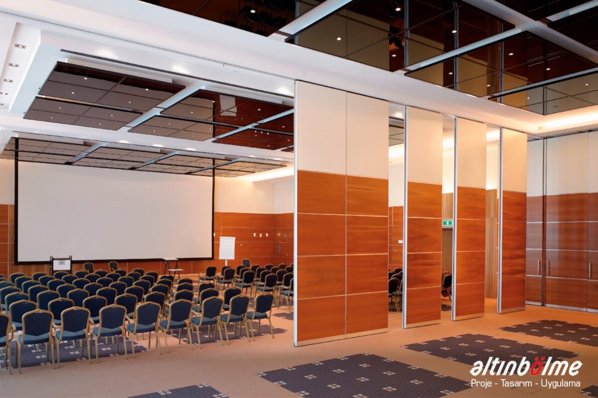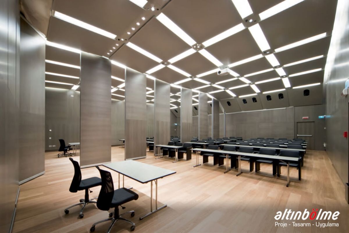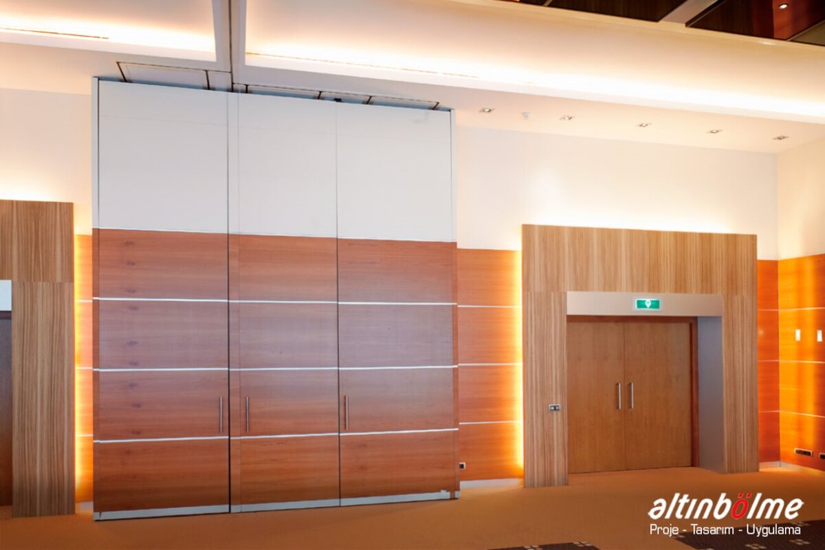Alnowall consists of independent modules that slide with roller bearings in a rail fixed to the ceiling. This system does not require non-aesthetic floor parts or floor joints. When closed, it aligns perfectly and is soundproof. The sliding motion is provided by one or two bearings and high-strength rollers. Each module consists of a metal frame covered with 16/18 mm thick wooden panels. These modules can be completed with a wide variety of coatings. The threshold profiles that provide the insulation at the bottom and top of the module are manually operated with the mechanism in the vertical profiles. Rubber seals on the threshold profiles ensure that the modules are closed between the rail and the floor. The last module of the system is a telescopic module that slides sideways and closes the system horizontally, Movable Partition Wall, it is operated manually or electronically with a remote located in the starter module. Alnowall can replace all modules except the telescopic module, without compromising the functionality of the system, Wooden Partition, by door modules of various sizes and types. Wall Partition Systems, Alnowall produces ideal solutions for the division of spaces by providing excellent sound insulation in spaces higher than 10 meters.