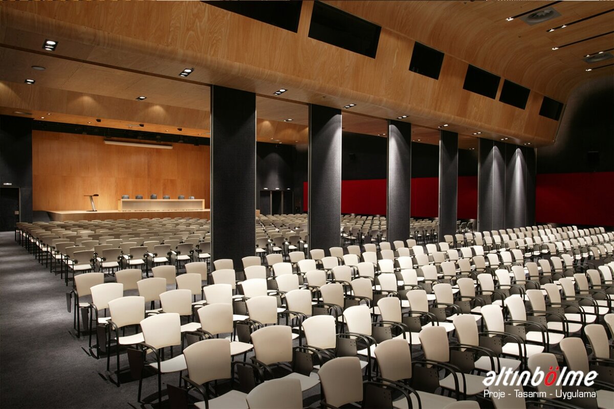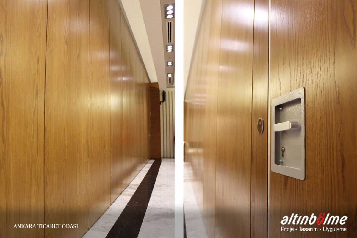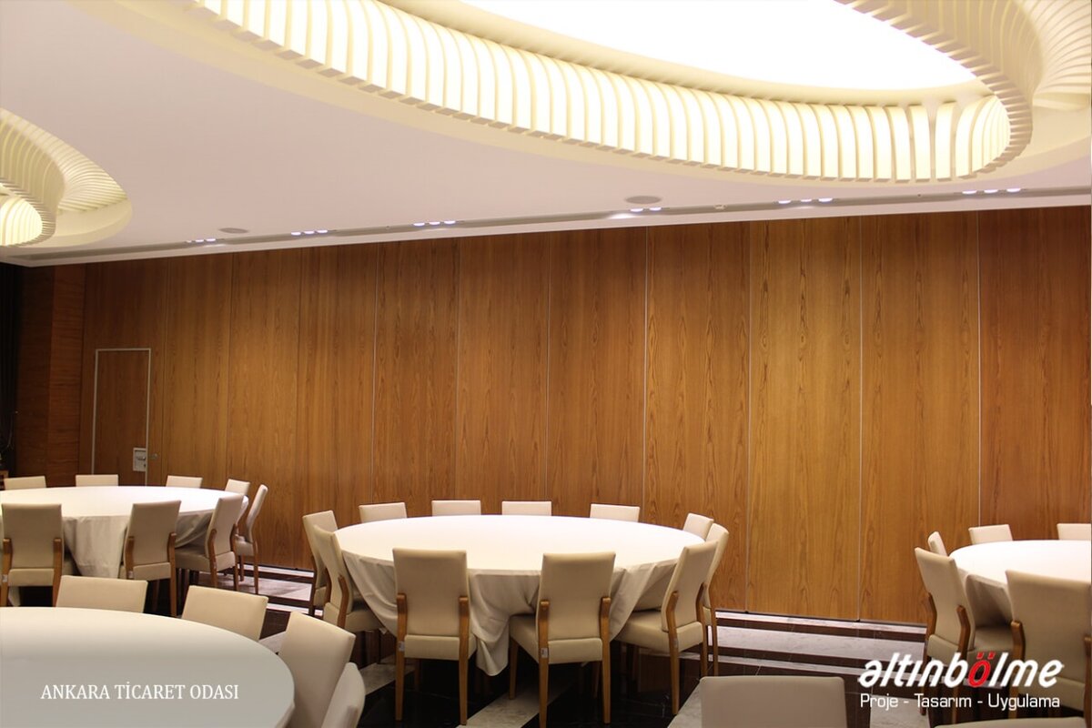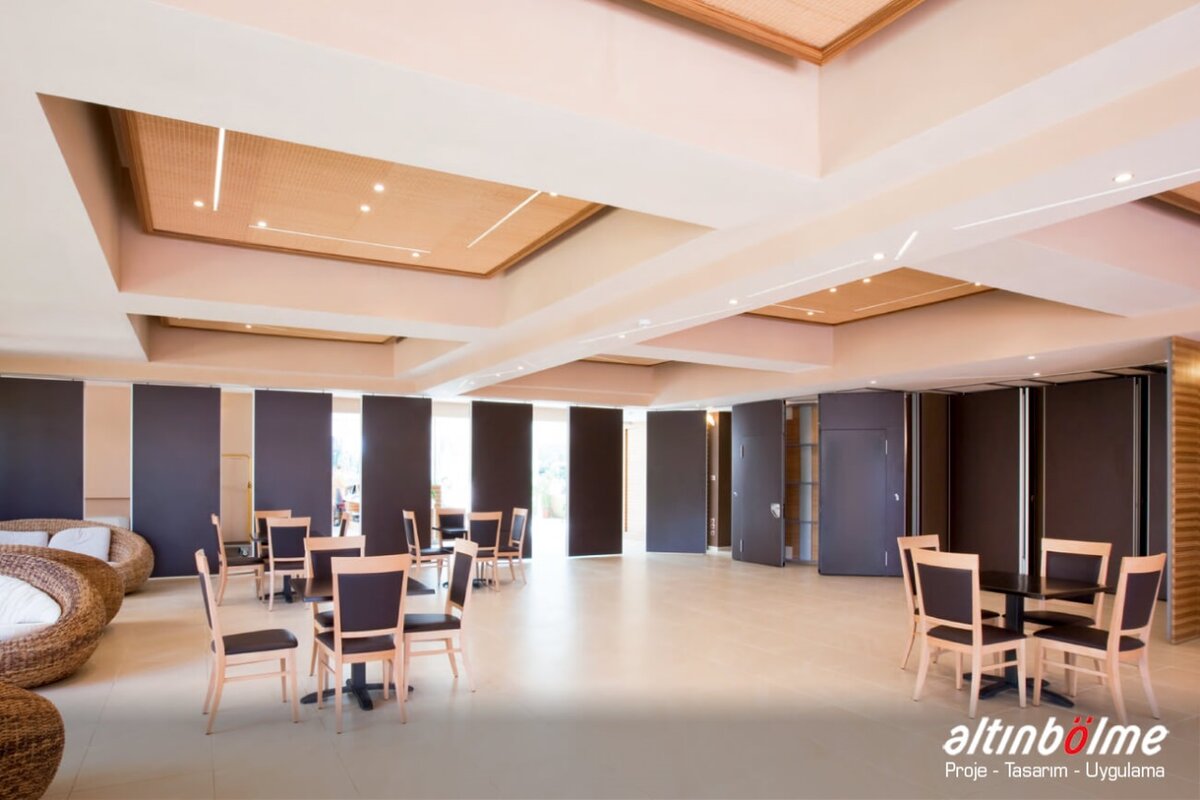 Alnowall consists of independent modules that slide with roller bearings in a rail fixed to the ceiling. This system does not require non-aesthetic floor parts or floor joints. When closed, it aligns perfectly and is soundproof. The sliding motion is provided by one or two bearings and high-strength rollers. Each module consists of a metal frame covered with 16/18 mm thick wooden panels. These modules can be completed with a wide variety of coatings. The threshold profiles that provide the insulation at the bottom and top of the module are manually operated with the mechanism in the vertical profiles. Rubber seals on the threshold profiles ensure that the modules are closed between the rail and the floor. The last module of the system is a telescopic module that slides sideways and closes the system horizontally, Movable Partition Wall, it is operated manually or electronically with a remote located in the starter module. Alnowall can replace all modules except the telescopic module, without compromising the functionality of the system, Wooden Partition, by door modules of various sizes and types. Wall Partition Systems, Alnowall produces ideal solutions for the division of spaces by providing excellent sound insulation in spaces higher than 10 meters.