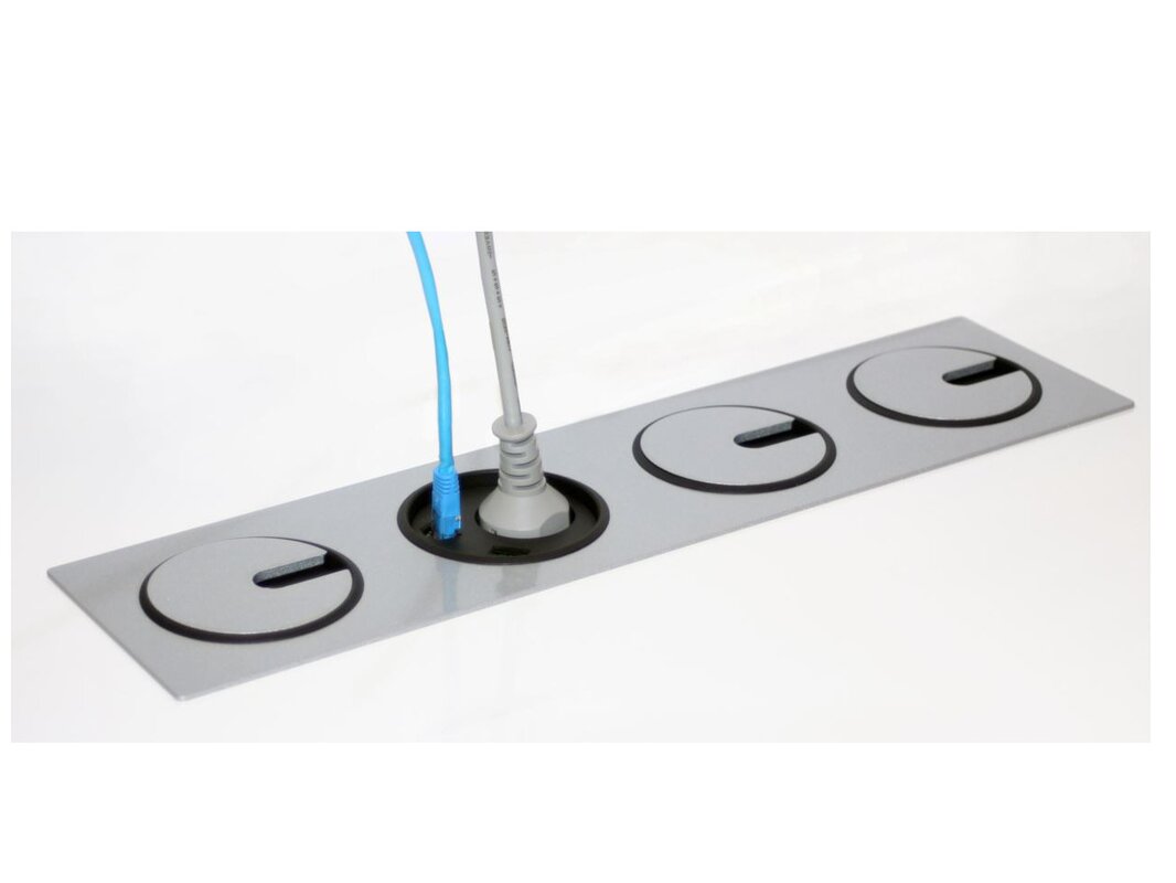 Power Dot wordt standaard uitgerust met 1x 230V met een 1,5 meter netsnoer v.v. randaarde stekker.Daarnaast is er een keuze tussen een uitvoering met 4 kabeldoorvoeren en een variant met multimedia connectoren en/of USB-charger. Power Dot met kabeldoorvoeren kan worden geleverd met vast profiel dat vlak aan het werkblad ligt, of met een in diepte verstelbaar profiel voor het nog beter wegwerken van de kabels. Power Dot met multimedia wordt standaard uitgevoerd met een in diepte verstelbaar profiel. Deze unit wordt standaard geleverd met een rond profiel en kan worden uitgebreid met een metalen frame en cover in verschillende kleuren.