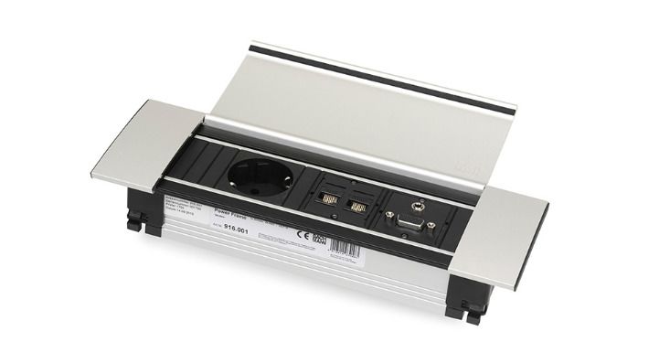 Deze inbouwunit is geheel naar eigen smaak in te vullen. U heeft keuze uit een smal frame dat de inbouwmodule geheel omlijst of een cover die de unit geheel afsluit en daarmee een fraai aanzicht aan een werkplek geeft.