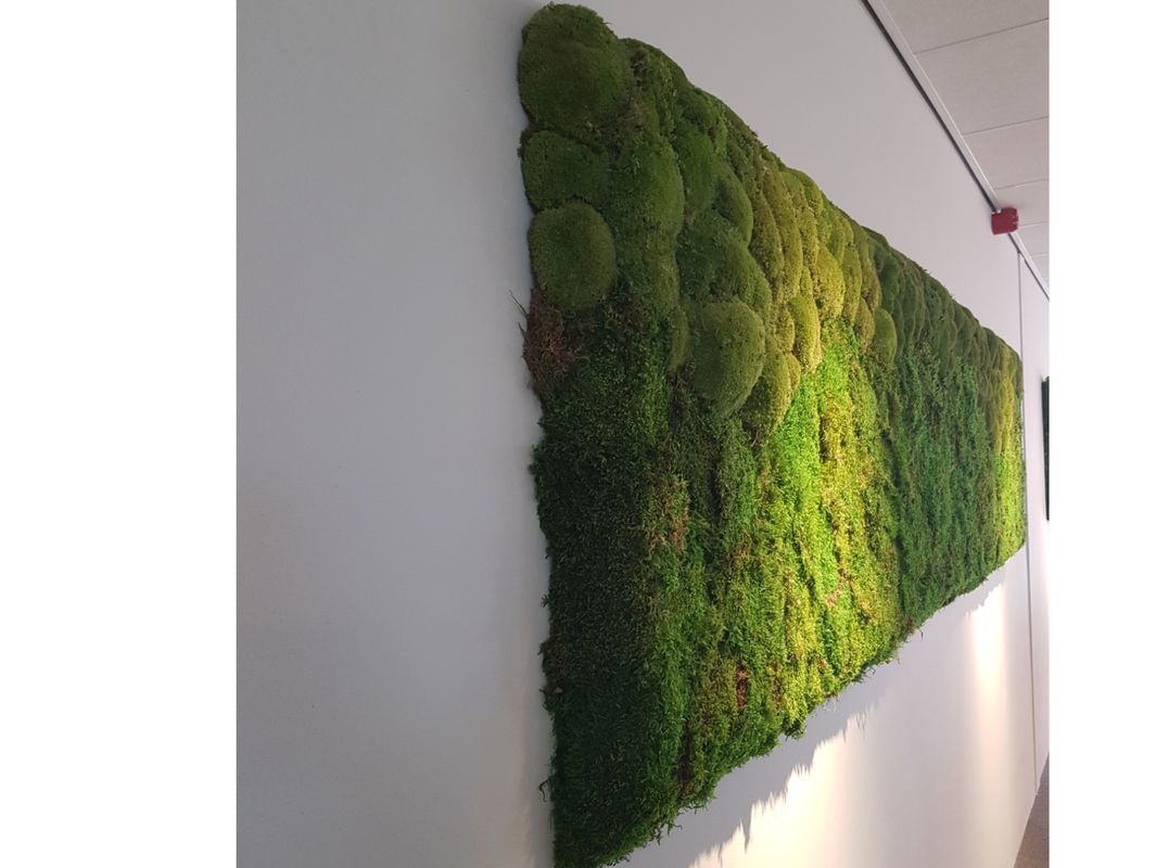 Designpaneel, geluidsabsorberend met 100% natuurlijk gemummificeerd mos. Leverbaar in elke gewenste afmeting met verschillende soorten frames. Akoestische rapporten op aanvraag beschikbaar. Ook mogelijk in vorm van room dividers en/of akoestische plantenbakken.