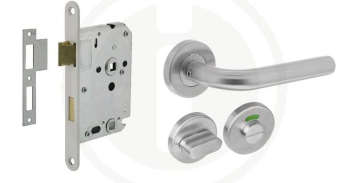 Deze deurbeslag set voor toilet-/badkamerdeuren bestaat uit een wc-slot met een bijpassende deurkruk en wc-sluiting. Het slot wordt geleverd in toilet-/badkamer uitvoering op 63 mm en met een 8 mm stift. De doornmaat van dit slot is 50 mm en wordt geleverd inclusief sluitplaat en roestvast stalen voorplaat. U kunt dezelfde inbouw- en freesmaten gebruiken als een standaard woningslot. De dagschoot van dit slot is omwisselbaar; dat wil zeggen dat deze voor zowel naar linksdraaiende als rechtsdraaiende deuren geschikt is. Deurkruk Recht op een ronde rozet is vervaardigd uit roestvast staal en is naderhand geborsteld, waardoor hij een matte uitstraling heeft. De rozet heeft een stalen onderconstructie en is voorzien van een veer, die ervoor zorgt dat de kruk na gebruik weer terugveert naar zijn originele horizontale positie. Deze deurkruk is geschikt voor een deurdikte van 38 - 54 mm en wordt per paar geleverd inclusief bijpassende wc-sluiting en bevestigingsmateriaal.