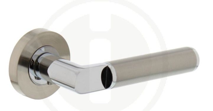 Deurkruk Jean op ronde rozet heeft een bijzondere kleurencombinatie en is uitgevoerd in mat nikkel en glanzend chroom. Deze deurkruk wordt per paar geleverd en het rozet is voorzien van nokken, waardoor de deurkruk beter op zijn plek wordt gehouden.