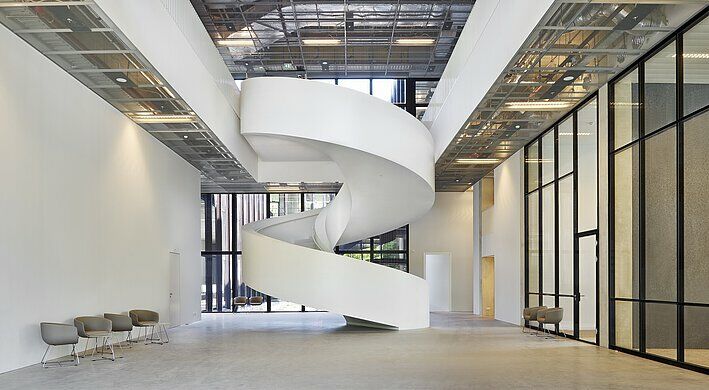 De EeSoffit™ garandeert een perfect naadloze afwerking voor de onderzijde van de trap. Zelfs op trappen met een complexe geometrie, zoals spiraal- of elliptische trappen - wat erg moeilijk en tijdrovend is om te bereiken met stucwerk.
