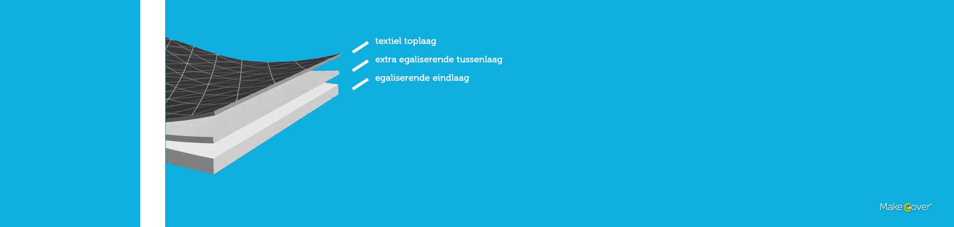 Het product is opgebouwd uit drie lagen. De bovenste zichtbare laag bestaat uit een textiel toplaag, waar alles op geprint kan worden. Dus visuals, kleurvlakken of patronen, het is allemaal mogelijk. De middelste laag is een egaliserende en isolerende laag die samenwerkt met de dikste eindlaag, die primair egaliserend werkt.