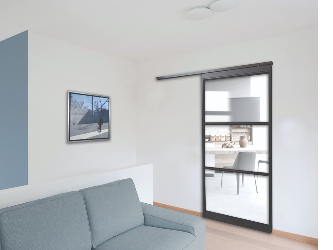 Keuze tussen een schuifdeur in een moderne of industriële look. De moderne look heeft een strak en discreet systeem met onzichtbare muurbevestiging. De industriële look heeft een vintage schuifdeurbeslag dat een stoer accent geeft en uitgerust is met grote wielen om zacht en sierlijk te rollen. Beide zijn ze plaatsbesparend doordat je geen rekening meer moet houden met een draaihoek
