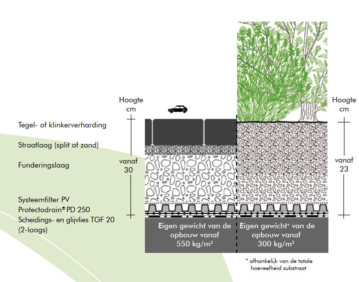 Tevens kan het substraat kan meestal gemakkelijk met shovels worden aangevoerd. Bij deze systeemopbouw zorgen de over het hele oppervlak geplaatste Protectodrain® drainage elementen ervoor dat de dakbedekking al tijdens de realisatie van het systeem tegen mechanische belasting is beschermd. Daarnaast zorgen de elementen, afgedekt met het systeemfitler TG en/of PV, voor de afvoer van overtollig hemelwater.De opbouw biedt in combinatie met Zincolit® Plus en de verschillende substraatlagen talrijke mogelijkheden voor beplanting en de vormgeving. Protectodrain® PD 250 is een stabiel, zwaar belastbaar drainage-element gemaakt van ABS-kunststof met aan de onderkant een gecacheerde rubberen beschermmat en een bevestigingsrand rondom.