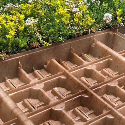 2. Waterbufferingslaag: Regenwater wordt capillair gebufferd in een substraat van licht geëxpandeerde kleikorrel. Het overtollige water dat niet kan worden opgeslagen, zal snel afvloeien. Om een extra buffer te creëren voor droge periodes wordt water ook niet-capillair opgeslagen doordat de afvoergaten op ca. 1 cm van de onderkant geplaatst zijn. Dit zorgt ervoor dat overtollig regenwater naar de dakafvoer(en) afgevoerd wordt.
