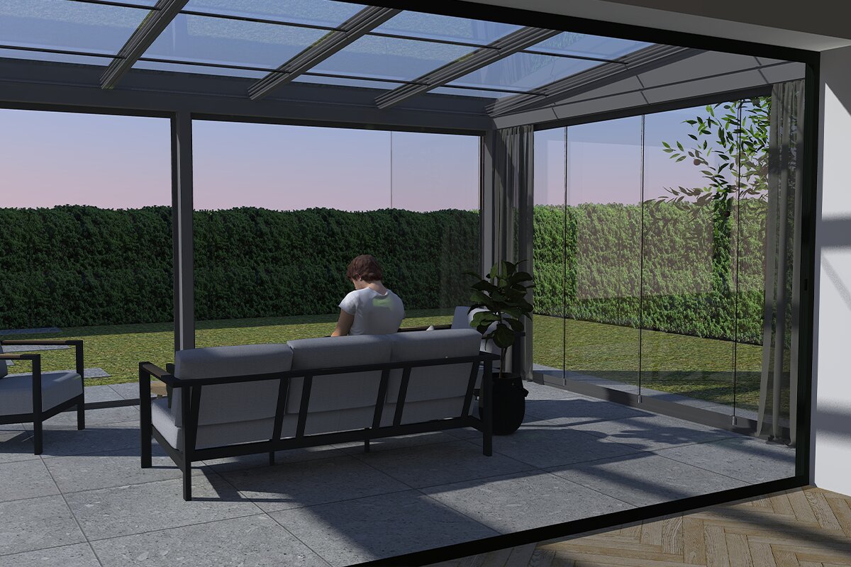 Deze innovatieve overkapping met een elektrisch of handmatig schuifdak zit in een horizontale gootconstructie waarmee de tuinkamer aan de woning horizontaal oogt. De strakke lijnen en fraaie details zoals de geïntegreerde dimbare verlichting geven het schuifdak een luxe uitstraling. Dit dynamische dak is een genot voor het oog en geeft optimaal comfort om ieder seizoen te genieten van het buitenleven. Dit model is zowel in glas als polycarbonaat uitvoerbaar.