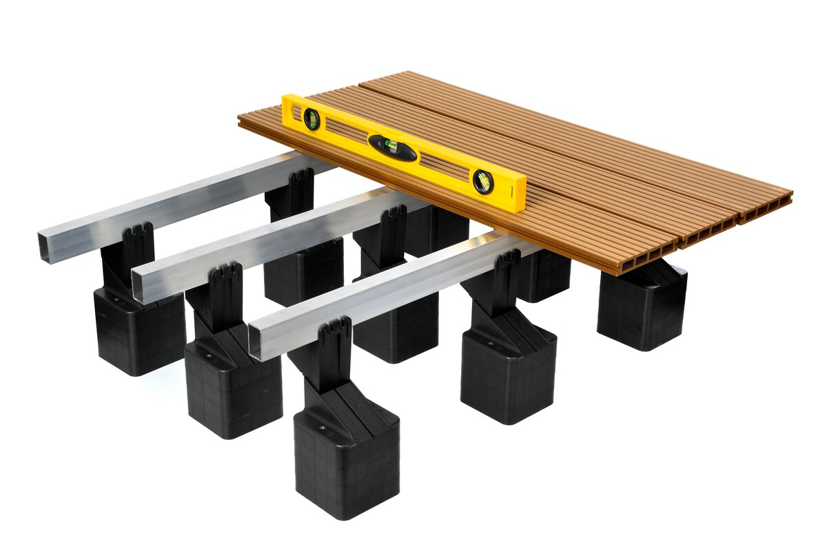 Voor verhoogde vloeren kunnen zowel aluminium als houten onderslagen worden gebruikt. Deze kunnen bijvoorbeeld worden geïnstalleerd op kunststof verstelbare terrasdragers. Voor extra stabiliteit is het soms aan te raden extra dwarsbalken toe te voegen. Met Raptor-terrasdragers van Envirolift is het mogelijk de onderslagen eenvoudig en snel te fixeren en op hoogte te stellen.
