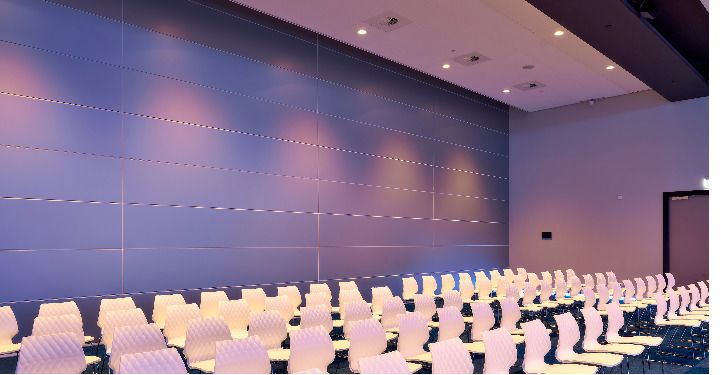 Naar beneden gevouwen is de Skyfold een dubbelwandige, vaste en akoestische wand met een geluidsisolatiewaarde die kan oplopen tot Rw = 59dB. Optioneel is een geluidsabsorptie mogelijk tot 0.65 NRC. Elk model is beschikbaar in talloze varianten, zodat we ook voor jouw ruimte een goede en passende akoestische oplossing kunnen bieden.