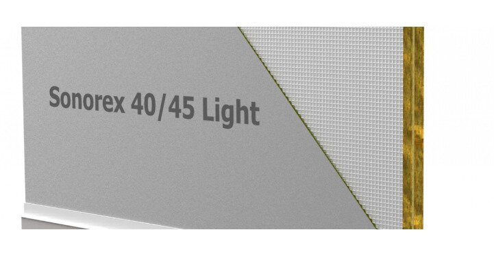 Sonorex® 40/45 Light schotten hebben een basis van steenwol en zijn aan de buitenzijde afgewerkt met versterkte aluminiumfolie. Tijdens de productie wordt er over het gehele oppervlak een Ultimate wol tussen de steenwolplaten aangebracht voor een optimale verwerking tijdens de montage. Op het project wordt de Sonorex® basis éénzijdig aan de direct verhitte zijde afgewerkt met de Sonorex® Easy Mass Light folie.