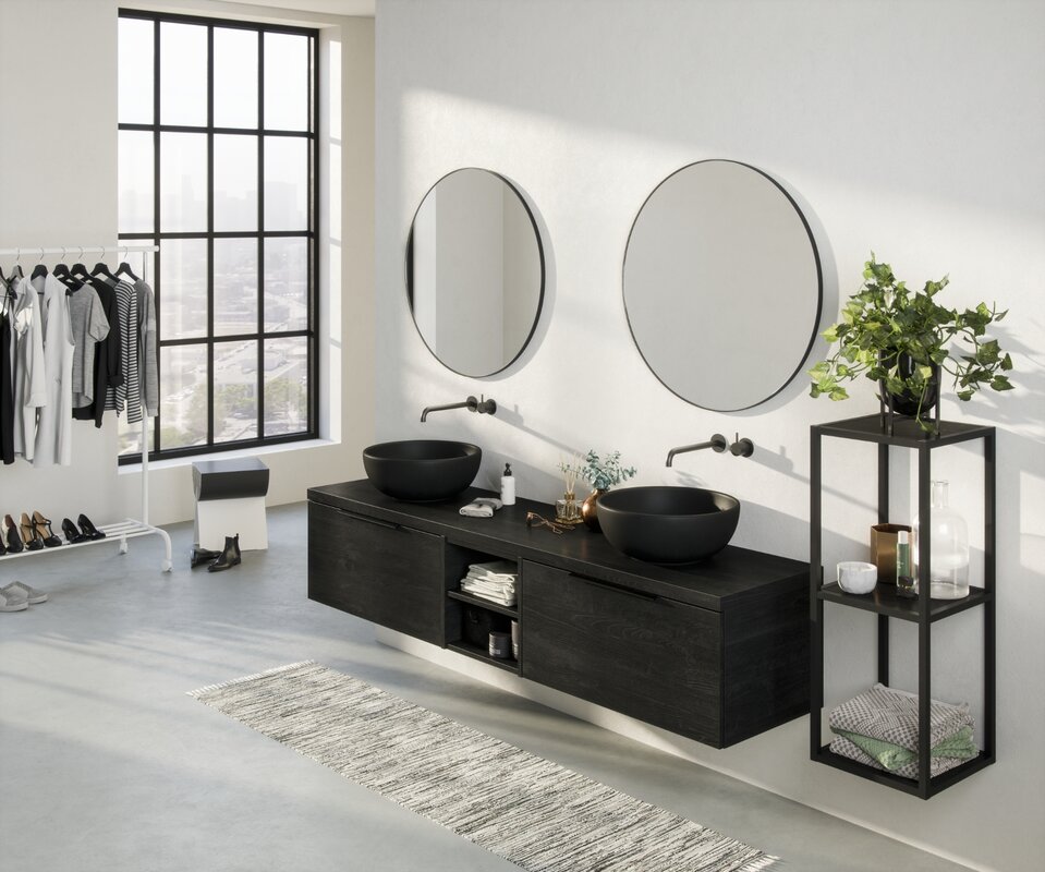 De serie Stone is een brede serie badkamermeubelen welke zich kenmerkt door de toepassing van opzetwaskommen in verschillende vormen en afmetingen welke worden geplaatst op een afdekblad van Composiet, HPL, op beton.