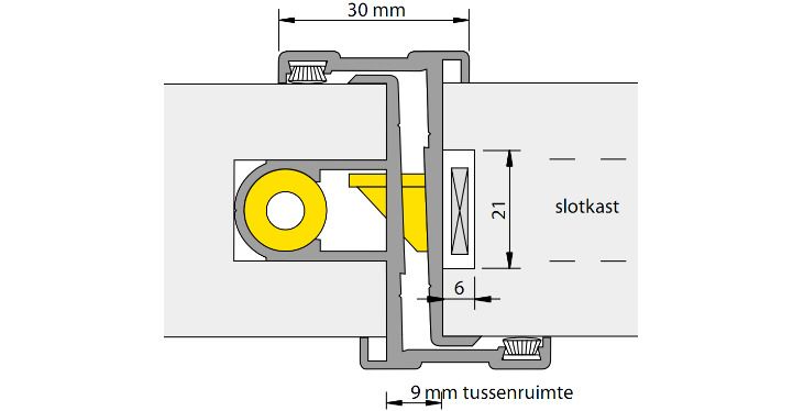Producteigenschappen, ....., achterliggend aangebrachte schuifgrendel, aluminium, deurnaald voor inbraakwerende dubbele deuren, benodigde ruimte tussen de deuren 9mm, F1, geanodiseerd mat-satijn, 235, vanaf onderzijde deur, 2, Onderdelen, 1.050, sluitpot boven vlakke flens, sluitpot onder met schuine flens, borstelstrippen, Din RS, Alprokon Aluminium Development B.V., 40, met voorzieningen voor slottype A - Standaard krukbediend, 1.900 vanaf onderzijde deur, Din LS, 54, gemoffeld (RAL), met voorzieningen voor slottype B - Standaard sleutelbediend, met voorzieningen voor slottype C - Comfort krukbediend, met voorzieningen voor slottype D - Comfort sleutelbediend, met voorzieningen voor slottype E - Comfort krukbediend met uitschakelbare mechanische paniekfunctie, met voorzieningen voor slottype F - Comfort krukbediend met uitschakelbare elektro-mechanische paniekfunctie, met voorzieningen voor slottype G - Comfort sleutelbediend/Life Line, zonder paniekfunctie