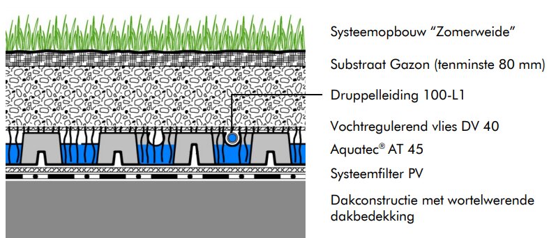 Het principe van een efficiënte irrigatie van groendaken doormiddel van een vochtregulerend vlies