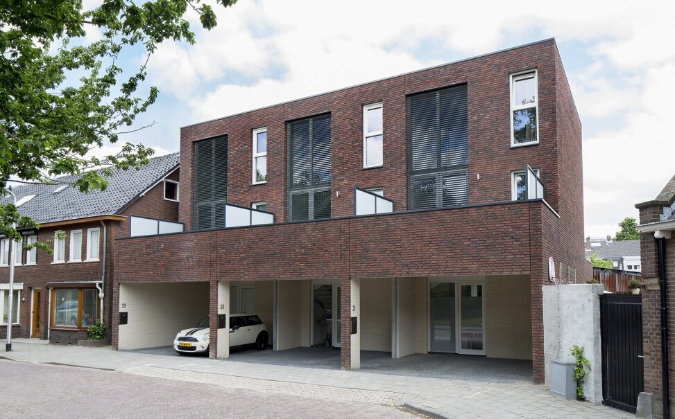 In een bestaande wijk met jaren’30 en ’40 woningen zijn aan een groen plein 3 drive-in woningen gerealiseerd.