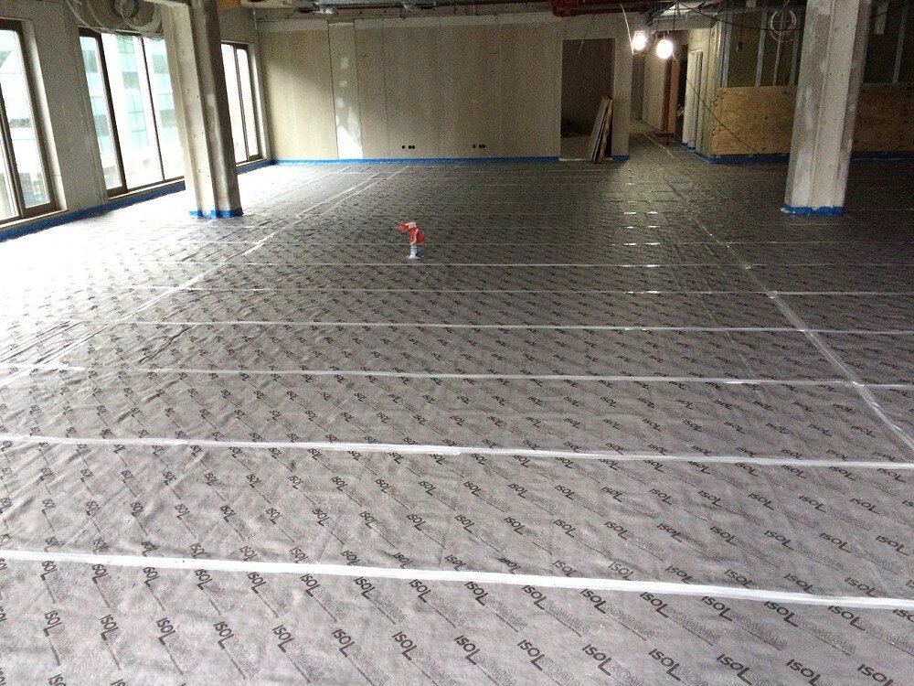 De vloeren in het gebouw bleken niet voldoende akoestisch te isoleren. Om toch aan de gestelde eisen te kunnen voldoen, moest er voor akoestische isolatie gezorgd worden. Maar de geringe opbouwhoogte van 50 mm liet maar weinig ruimte voor een duurzame en betrouwbare oplossing. Daarnaast zat er veel hoogte verschil in de constructievloer en liepen er diverse leiding overheen. Een uitvullaag was dus noodzakelijk. Vloerenbedrijf Nicky Huisman B.V. uit Berlicum, verantwoordelijk voor de complete vloerverzorging, schakelde de experts van ISMT in.