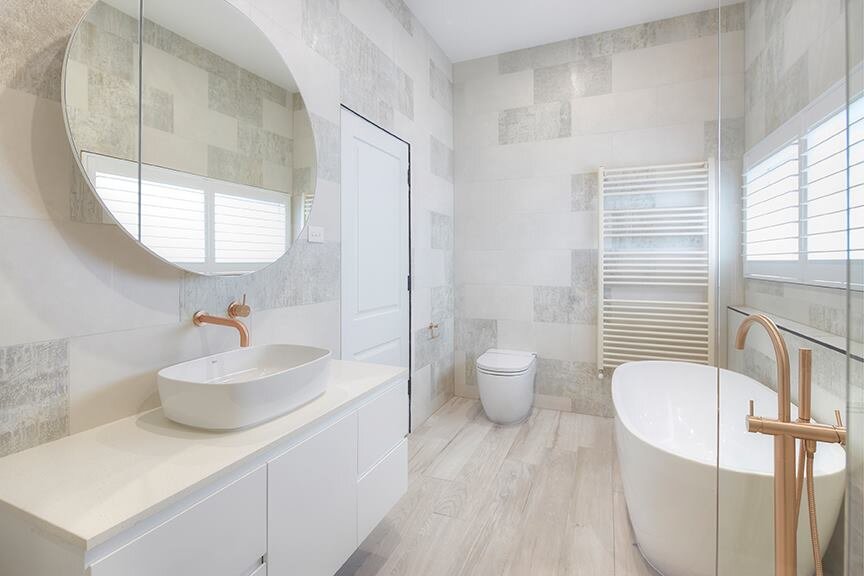 Het leek zowaar een antieke badkamer maar hij was kwalitatief gedateerd helaas. Alhoewel de ruimte redelijk krap is hebben we door middel van het verschuiven van de toegangsdeur en de badkamer elementen, een hele nieuwe praktische indeling gecreëerd. Ook hebben we het kozijn vervangen en een nieuw kozijn toegevoegd om meer natuurlijk licht binnen te krijgen. En als laatste hebben we een schuifdeur toevoegt om een verbinding te maken met de slaapkamer zodat de badkamer ook ensuite is. De tegelvloer is van wit/grijs houtmotief en de wanden zijn een mix van grijs en marmer look. Verder is veel met wit gewerkt om de ruimte lichter te krijgen. De kranen zijn uitgevoerd in rosé goud.