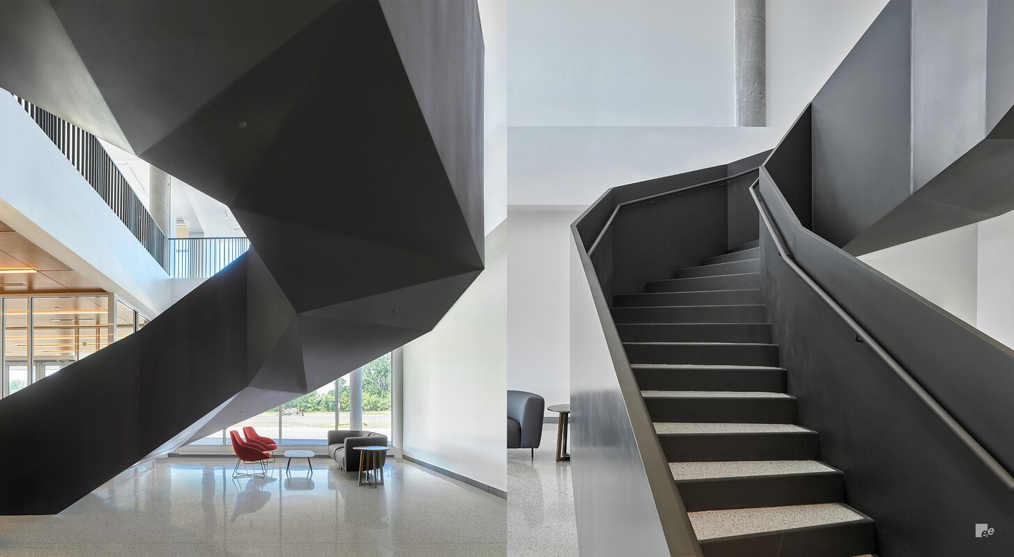 De trap die EeStairs maakte voor de herbestemde Bata-schoenenfabriek in Ontario, Canada, was ongewoon qua vorm en structuur. De ontwerpers, BDP Quadrangle in samenwerking met Dubbeldam Architecture + Design, wilden dat de trap in de ontvangsthal balustrades met gedurfde facetten en bovenlichten zou hebben - en zelfdragend zou zijn.