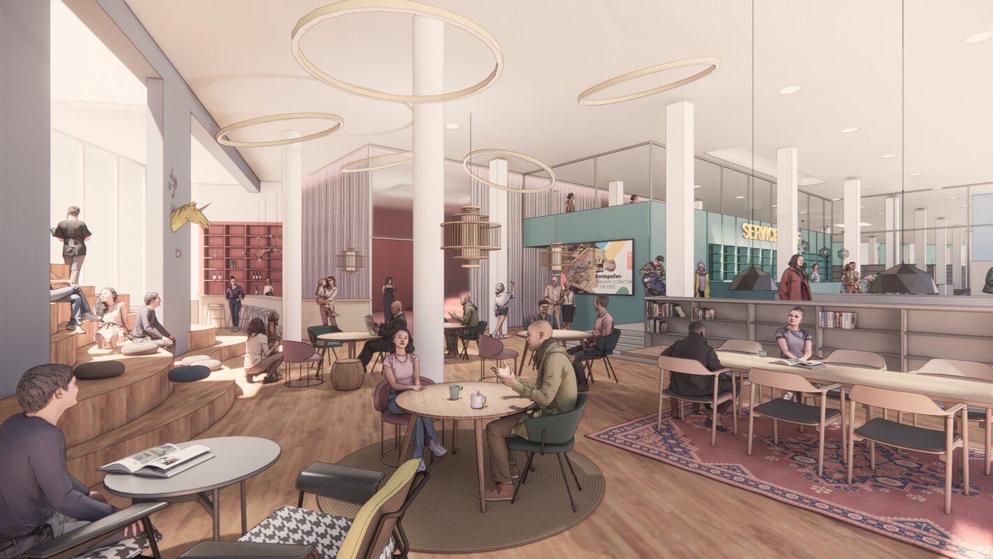 Een bibliotheek is het meest publieke en inclusieve gebouw van de stad. Het is daarom belangrijk dat iedereen zich er welkom en op zijn gemak voelt. Behalve dat het gebouw integraal toegankelijk is voor een divers publiek, is ook de uitstraling en de sfeer van het gebouw inclusief. Een bibliotheek moet niet imponeren, maar er moet voor iedereen een plek zijn die “past”. Daarom maken we een variatie aan plekken en sferen. De sfeer is levendig en vriendelijk. Een gezellige huiskamer, waar je op een bank of luie stoel kan zit- ten. Rustige werkplekken met ruime lege tafels. Een speelse, uitdagende en gezellige jeugdafdeling, die de rust op andere afdelingen niet verstoord. Op je reis door het gebouw kom je beschutte ruimtes tegen om je terug te trekken en grote ruimtes waar je anderen als vanzelfsprekend ontmoet.