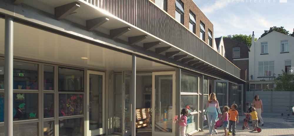 Aan de achterzijde heeft het gebouw - naar het plein toe - een transparante speelgang, waar kinderen ook bij minder weer kunnen spelen en rennen. Het grote plein is ook ingericht naar een ontwerp van Abrahamse de Kock Architecten en biedt voldoende ruimte om te spelen, rond te rijden en te stoeien, maar ook om te relaxen.