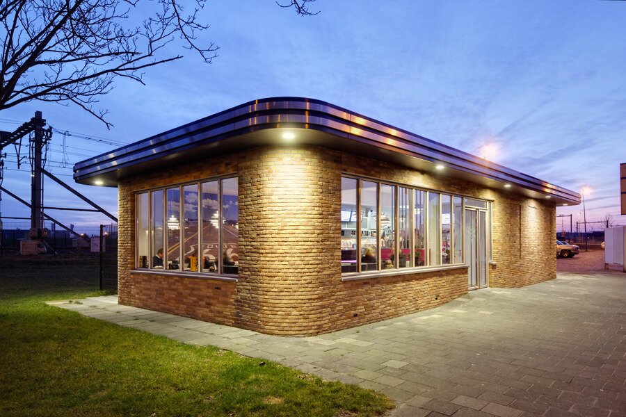 Het gebouw is opgebouwd uit een prachtige bakstenen laag met ronde hoeken en twee grote glasvlakken met minimaal gedimensioneerde kozijnen. Het cafetaria staat langs een doorgaande weg waar veel mensen passeren, deze hoge ramen laten de zittende mensen zien. Hierdoor ontstaat er een levende etalage die voorbijgangers prikkelt en als het ware naar binnen trekt.