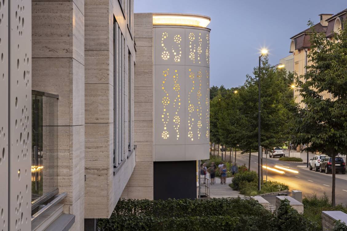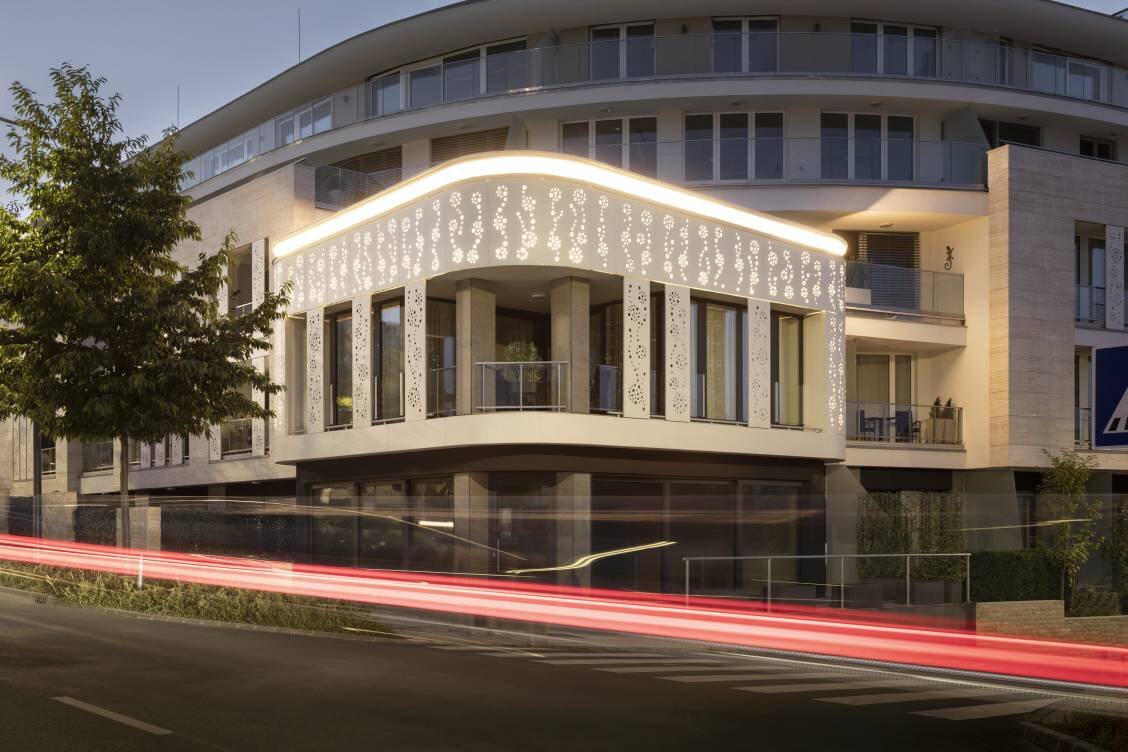 De panelen zijn geperforeerd met individueel gecreëerde patronen die het gebouw een bijzondere levendigheid verlenen. De curve van het primaire lichaam van het appartementsgebouw wordt benadrukt door een geprononceerde entreestructuur, bekleed met aldus vormgegeven Swisspearl panelen. De delicate ronde perforaties in verschillende afmetingen vormen een organisch patroon en laten lichtstralen door de panelen schijnen. Swisspearl panelen zijn ook toegepast als verticale schuifluiken op de balkons van de bovenste verdiepingen.