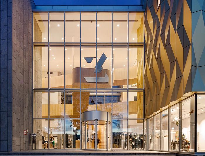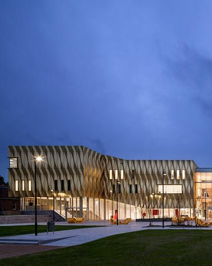 ''De opdracht was om een gebouw te ontwerpen dat alzijdig is, dus zonder specifieke voor- en achterzijde”, vertelt André van der Slik van ontwerpbureau De Zwarte Hond. “Daarbij wilden we de grenzen vervagen tussen binnen en buiten. Het glas in het gebouw speelt hierbij een grote rol. Het gebouw bestaat uit 2 volumes, één voor de bibliotheek en één voor Zinder Educatie (centrum voor de kunsten). Zinder Educatie is als het ware opgetild en in een gouden doos gestopt. Eronder bevinden zich op de begane grond grote glazen wanden, die het mogelijk maken om de functies van het gebouw aan passerend publiek te laten zien. Repetities van de dansers, het beeldhouwlokaal, een concert. De bibliotheek zoekt meer verbinding met de historische binnenstad. Ook hier laten grote etalages zien wat er binnen gebeurt.”