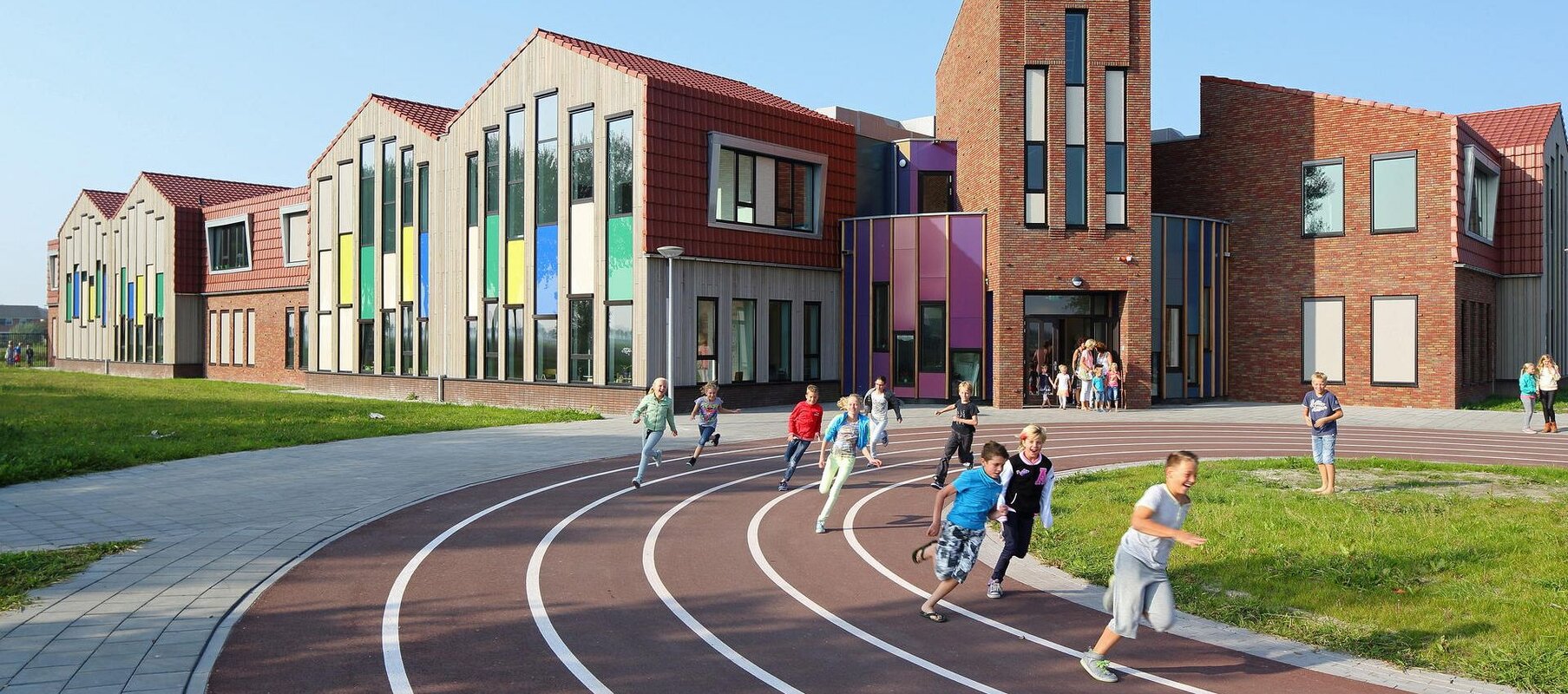 Grote aandacht is er voor de verkeersveiligheid. De diverse parkeervakken zijn buiten schooltijd ook te gebruiken door bezoekers van het nabij gelegen sportpark en het centraal gelegen Kiss&Ride plein is ingericht als atletiekbaan. De gebouwen zijn uitgevoerd in natuurlijke materialen die mooi verouderen en passen bij de omgeving. Red cedar, een warme, gemêleerde baksteen en rode pannendaken. Een warm welkom in Warmenhuizen!