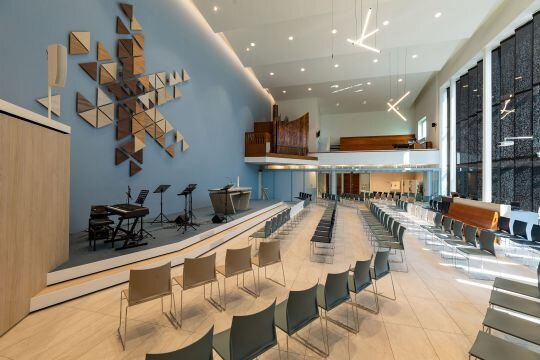 Om de draaiing van de kerkzaal ruimtelijk uitdrukking te geven, zijn een nieuw podium en een nieuwe aandachtswand geplaatst. De schuine lijnen van de berging en de orgelvloer zorgen voor perspectivische belijning naar het liturgisch centrum toe. Voor het nieuwe liturgische centrum is speciaal liturgisch meubilair en een ruimtelijk element op de aandachtwand ontworpen.