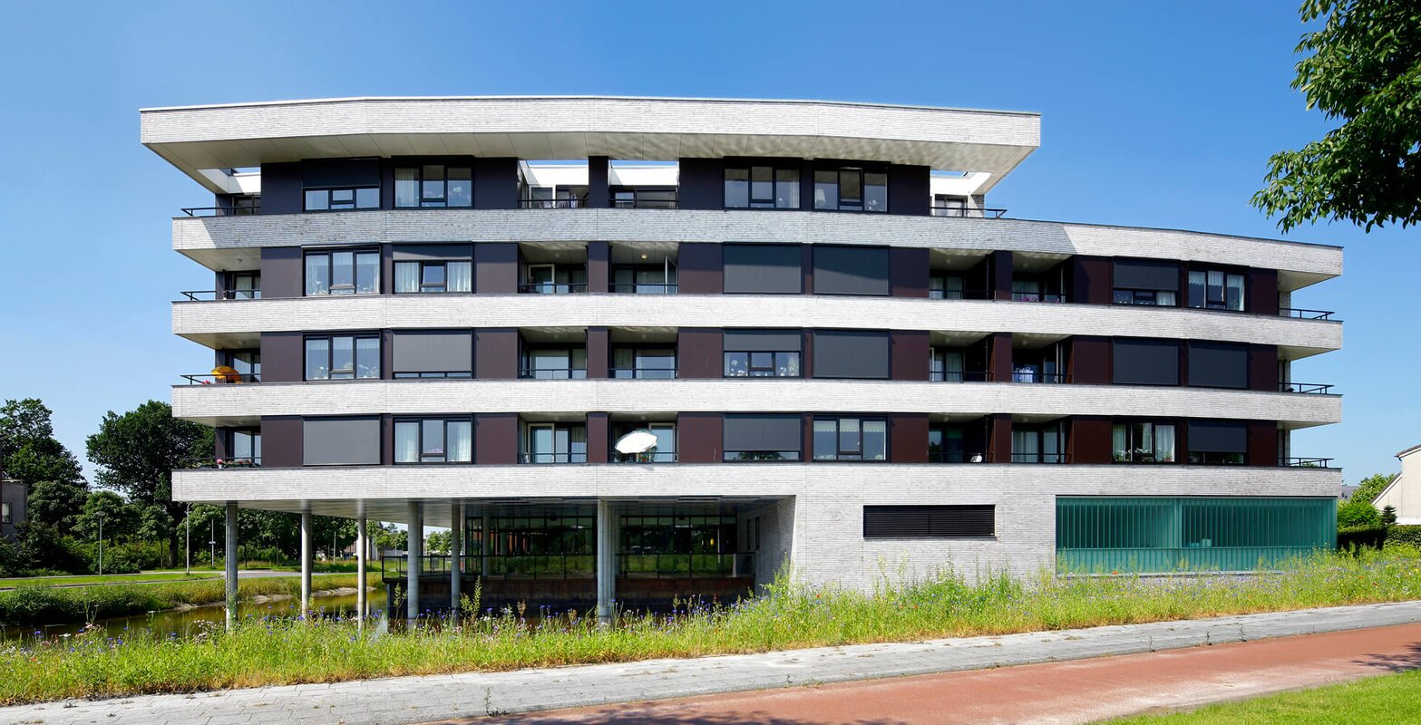 De aanleunwoningen bevinden zich in de kop van het gebouw, zwevend boven de waterberging van de wijk. Verrassend is het plafond van de witte kop boven het water. De kop is horizontaal vormgegeven door de witte metselwerk banden die stootvoegloos gemetseld zijn. De zorgappartementen hebben als contrast een verticale gevelindeling met smalle oranjekleurige stenen penanten met een diepe negge.
