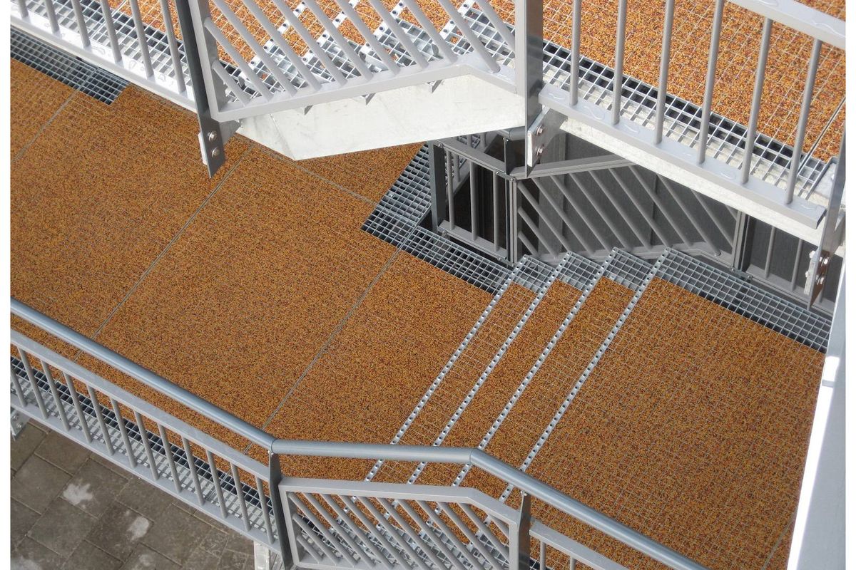 Dejo roosters worden veel toegepast in galerijen, bruggen, trappen en bordessen. De voordelen van een rubbervulling zijn vooral: stroefheid, geluiddempend en kleurrijk. Er zijn diverse rubber granulaat mengsels verkrijgbaar: van standaard zwart naar gemixte kleuren. In dit project is type Camel toegepast wat een mix is van rood, zwart en geel.