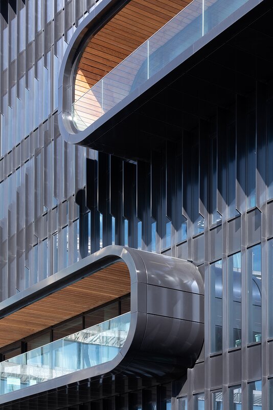 De lijnen in de gevel van het DK85 gebouw aan de Amsterdamse Houthaven zijn als watergolven. Daarmee doet het pand recht aan de locatie waar het staat.