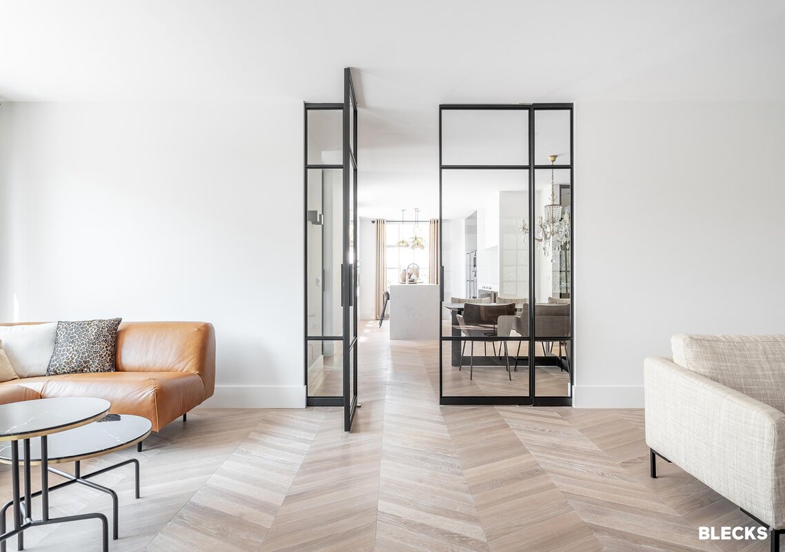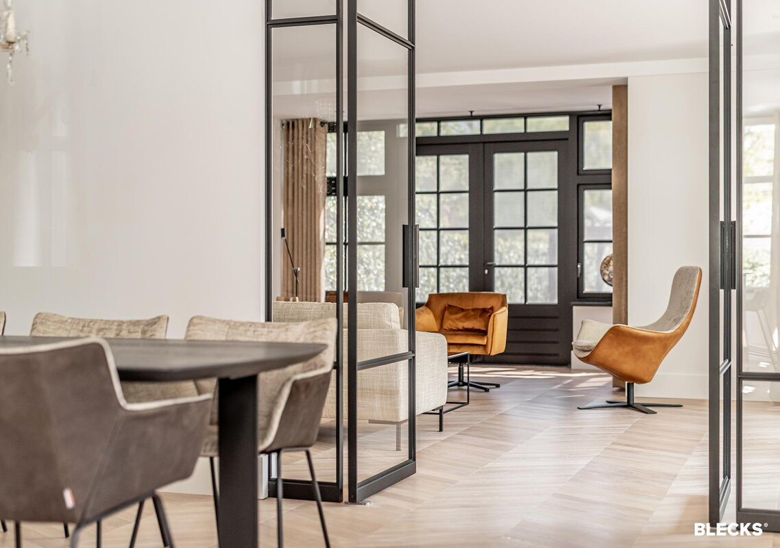 Zwarte stalen taatsdeuren in een tijdloos interieur