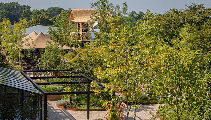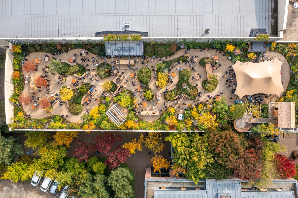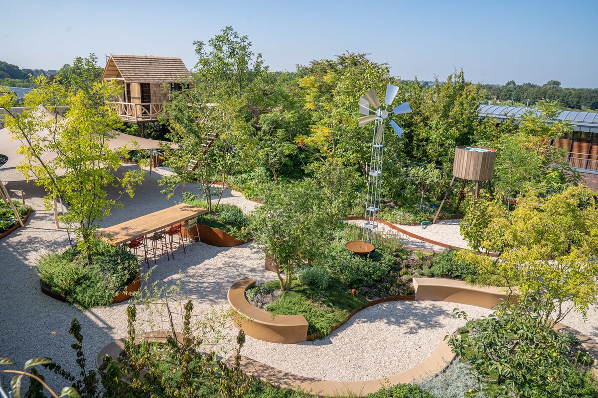 Een verscheidenheid aan meerstammige bomen en struiken karakteriseert het 1.400 m2 grote dak, gecombineerd met eilanden van vaste planten, fruitbomen, kruiden en gevelgroen. Het is een afwisselend, organisch landschap met knusse zithoeken, een kas, een pergola en een bar, maar ook zwevende eettafelstoelen aan een zwevende tafel en 3D-geprinte banken. Verder is er een windmolen die de drinkschaal van de vogels door middel van een overstort automatisch bijvult, een groot vogelnest en vogelkastjes van een vogelwerkgroep. De gigantische boomhut met een prachtig uitzicht over het landschap en de daktuin maakt het geheel af. Een strook bomen met samengesteld blad, beplanting met voornamelijk grote bladeren en veel varens zorgen bij de boomhut voor een junglegevoel.