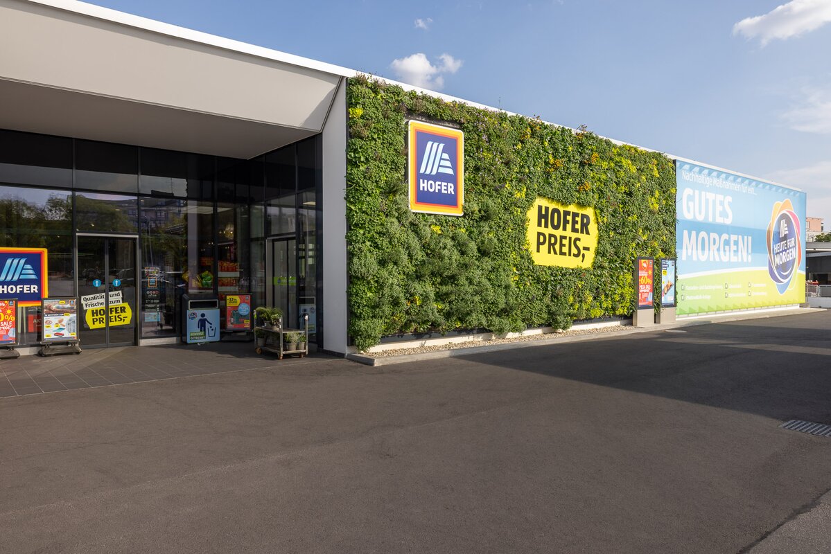 HOFER zet zich namelijk actief in voor klimaatbescherming. “Duurzame maatregelen voor een GOEDE TOEKOMST” is hun motto. “Groene gevels, de vermindering van het hitte-eilandeffect en de daarmee samenhangende verhoging van de levenskwaliteit in de directe omgeving van de winkels zijn hier een belangrijk onderdeel van”. Het idee voor de groene gevel had dus al goede bodem bij het bestuur en doordat een filiaal in Engeland ook al eerder zoiets had laten installeren waren ze snel overtuigd van het Mobilane systeem.