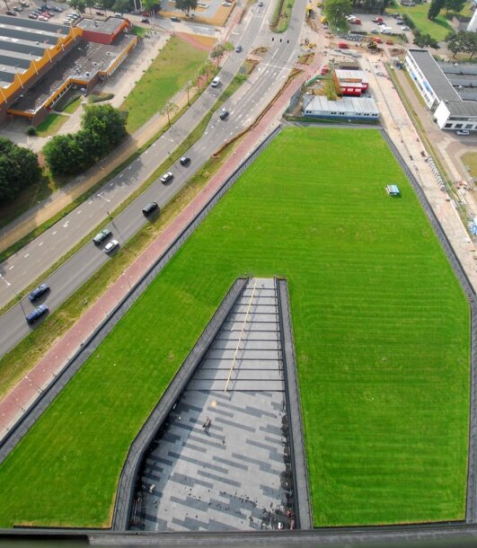 Het groendak loopt van het maaiveld tot aan het kantoorgebouw gestaag omhoog. Op het dak is een opbouw met Floradrain® FD 40-E en gazonsubstraat met een hoogte van minstens 20 cm toegepast. Om het geheel direct een groene uitstraling te geven zijn er graszoden aangebracht.