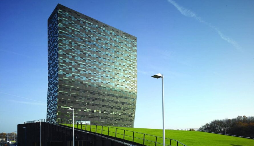 De toren staat op een groene helling en is vloeiend geïntegreerd in het omliggende Goffert Park