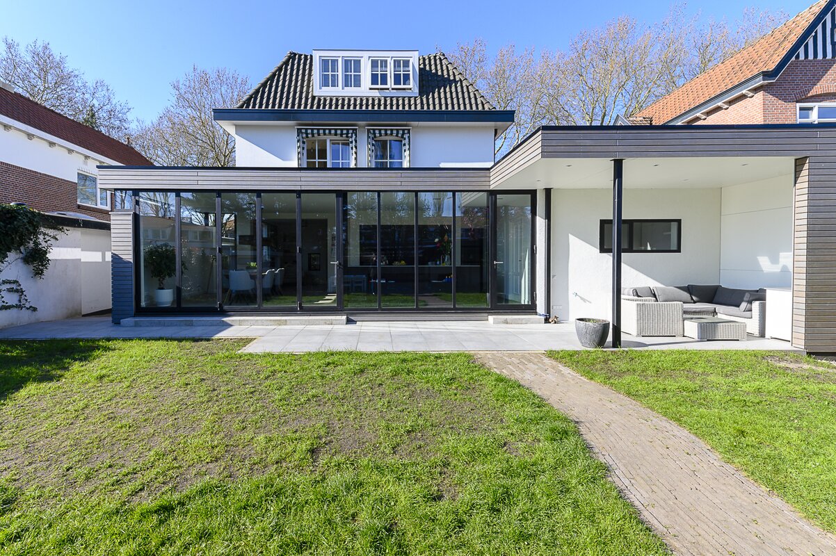 De achtergevel bestaat uit stalen kozijnen en een stalen schuif-/vouwpui. deze kan over de gehele breedte open worden geschoven.