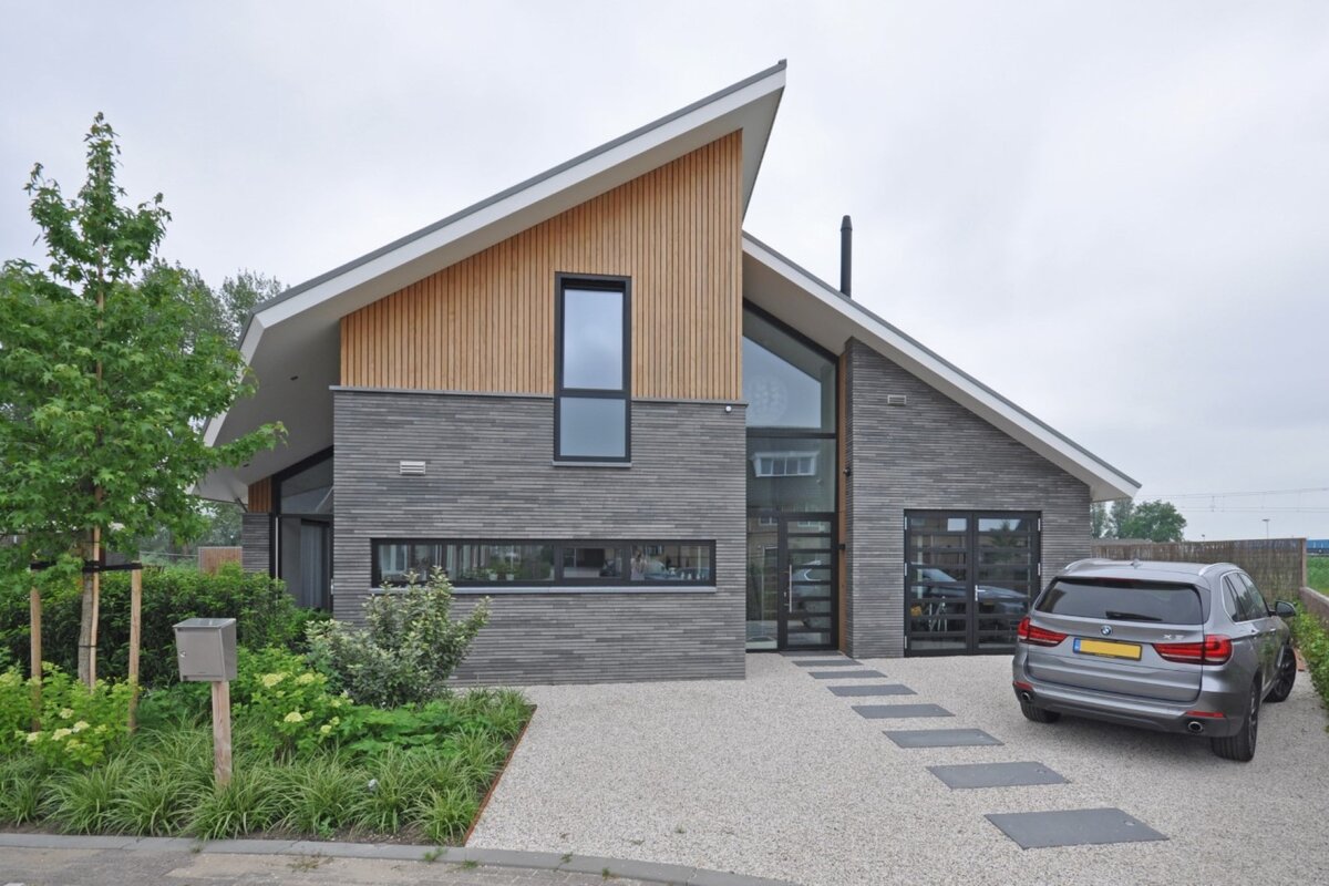 De twee lessenaarsdaken vormen het silhouet van deze villa. De gevel is vormgegeven als een compositie van verschillende vlakken en openingen. De dubbelhoge entreepartij, met daarachter een vide met de trap, vormt het middelpunt in de voorgevel.