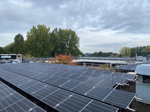 Op dit indrukwekkende dak van maar liefst 2.800 m2 groot staan 590 zonnepanelen op speciale frames verhoogd boven het dak, zodat ze koeler blijven, en daardoor het rendement en de levensduur van de panelen verbeteren. Onder deze panelen wortelen 57.000 sedum Plus en bijen- en vlinderplanten. Dit groendak buffert water, verkoelt en verlengt de levensduur van het bestaande dak.
