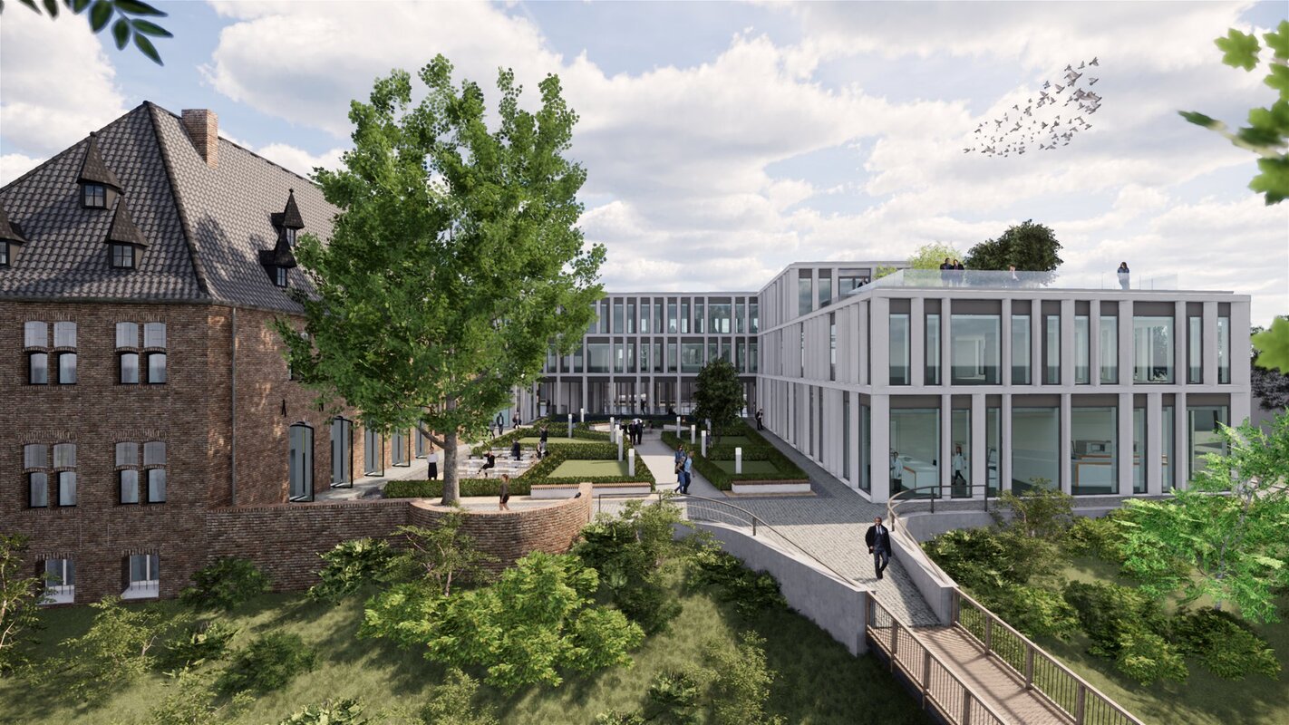 Het U-vormige ensemble van de nieuwbouw omsluit een nieuwe, moderne kloostertuin. Aan de ene kant begrensd door de rivier de Niers, verbindt het een openbare route van het stadscentrum naar het aangrenzende park.