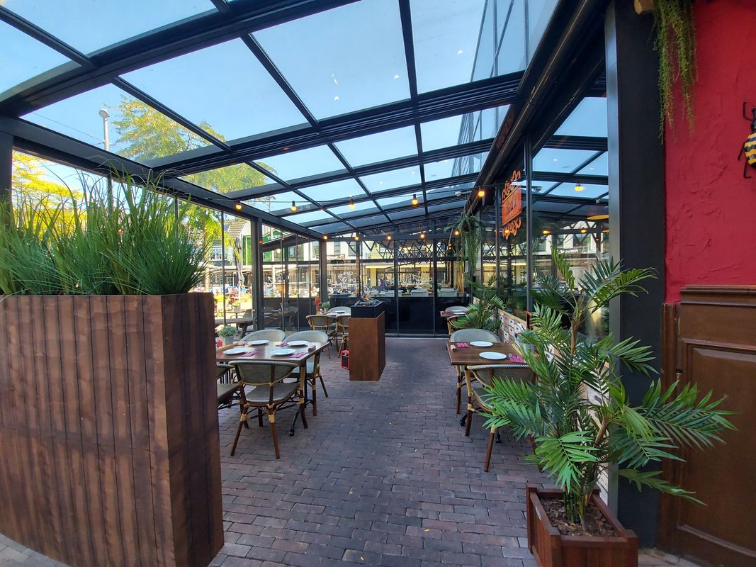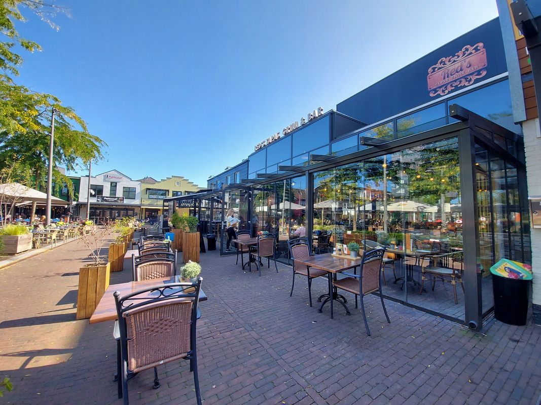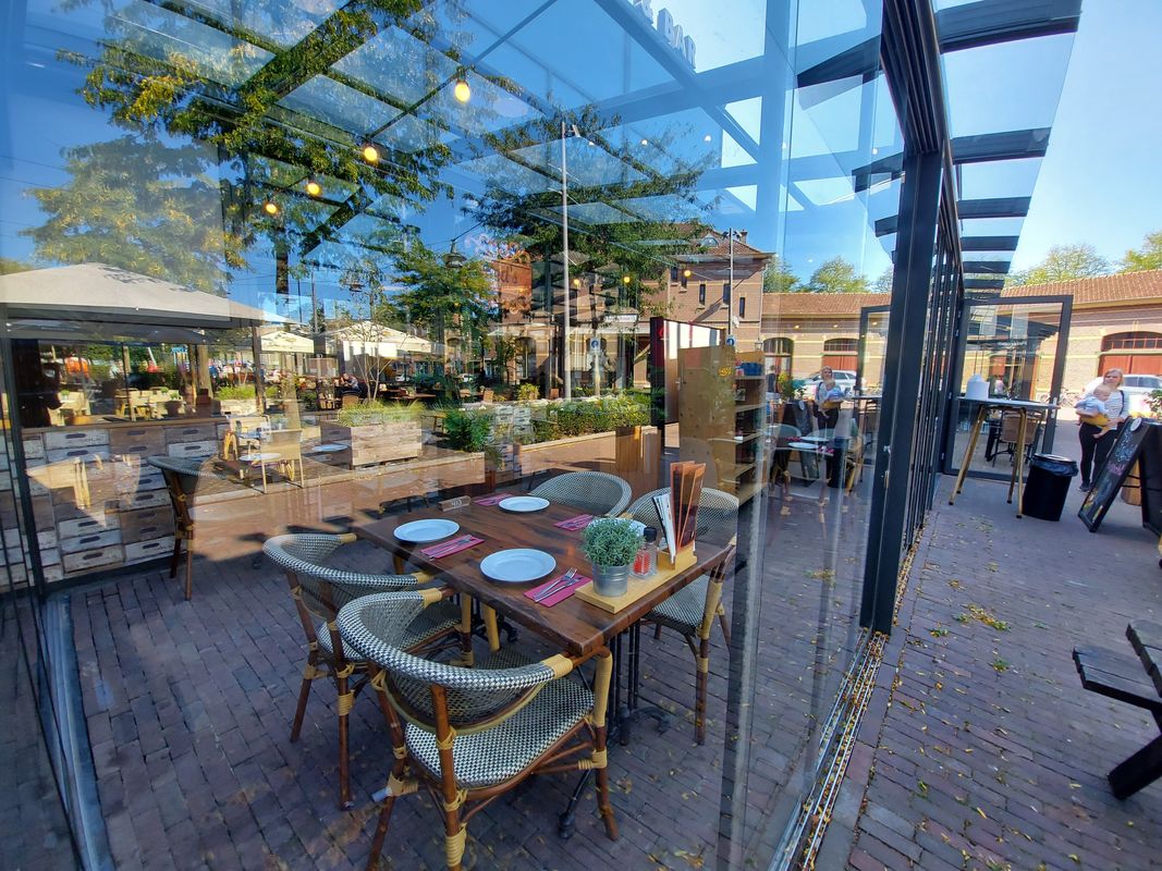 Een glazen horeca-overkapping met schuifdak en schuifwanden en een overstek. Zo transparant mogelijk. Zo kan het dak in de zomer open en in de herfst en winter dicht. In de lente warmt het terras al heerlijk snel op door de sterkte van de zon die door de glaswanden versterkt. Alle avonden kunnen worden verlengd, in het licht of in donker.