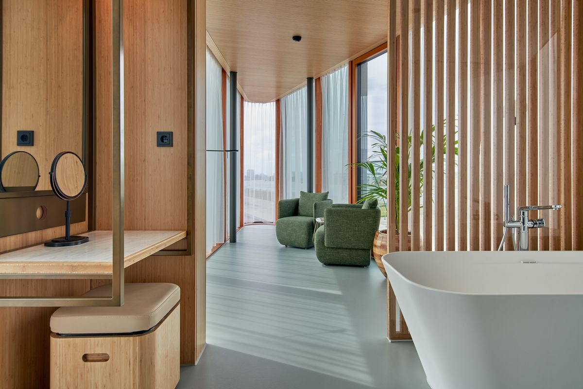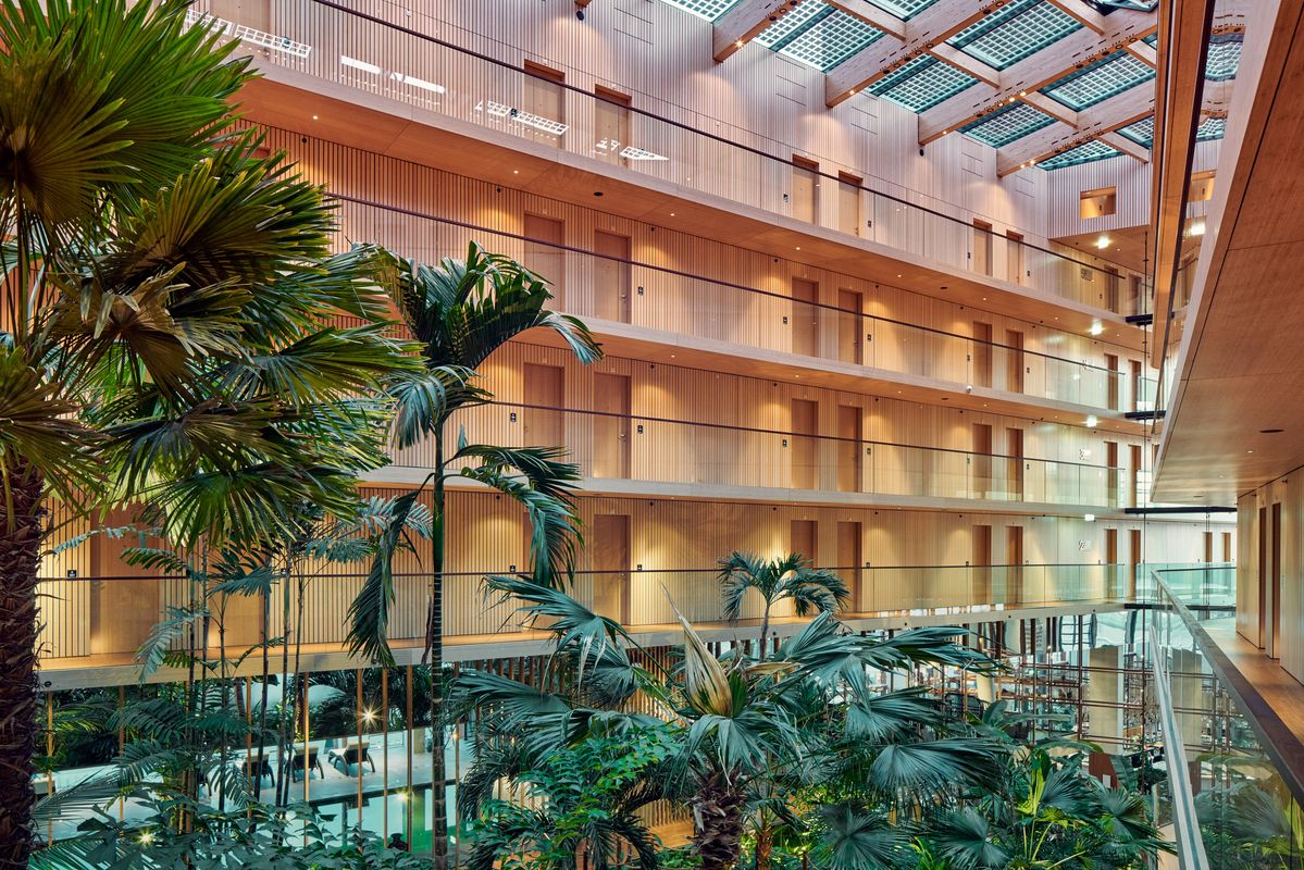 Een voorwaarde voor het ontwerp van het hotel was dat hele hoge eisen op het gebied van duurzaamheid moesten worden gehaald. Ook moest het hotel de verbinding aangaan met de buurt, en ook voor hen een belangrijke plek zijn. ‘We besloten dat de tropische, overdekte binnentuin letterlijk het hart van concept moest zijn. Een tuin die niet - zoals de andere tuinen - alleen voor de bewoners toegankelijk is maar voor iedereen.’ Meestal vormen binnentuinen het sluitstuk van het ontwerp, meer de groene invulling van het gebouw. ‘Hier is dat niet zo, we zijn echt juist begonnen bij de tuin en hebben het gebouw eromheen gebouwd’, legt Francois uit. Het atrium met de subtropische binnentuin, een samenwerking met de Hortus Botanicus, is het kloppend hart van het hotel. Het fungeert als temperatuurregelaar zowel in de zomer als in de winter. Aan alle kant van het gebouw hebben de kamers hun eigen beschutte buitenruimte, die tegelijkertijd als zonwering werken. In de publieke ‘pasar’ met diverse bars, restaurants en koffiecorners, een wellness en ruimte voor culturele activiteiten ontmoeten zowel hotelgasten, als eilandbewoners en andere Amsterdammers elkaar.