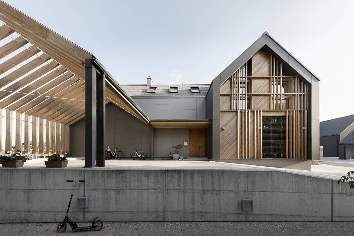 Het huis bestaat uit drie volumes met dubbele zadeldaken: Twee ervan staan loodrecht op elkaar en lopen parallel, waardoor er buiten een beschutte woon- en eetruimte ontstaat. In zijn essentie is het ontwerp van SoNo Architects een moderne interpretatie van een boerenstal.