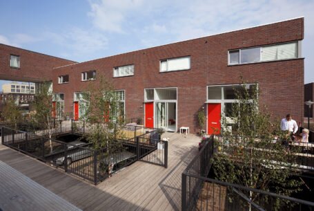 De woningen zijn gesitueerd binnen het compacte stedenbouwkundig plan van Roelf Steenhuis voor een van de velden van IJburg