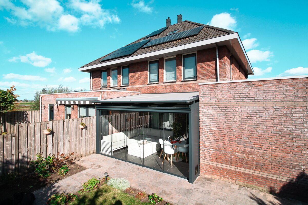 Er is gekozen voor het meest flexibele, transparante dak van Ittalum. Een glazen schuifdak. De 4 segmenten kunnen voor 75% worden geopend. De warme lucht die naar boven stijgt, kan de tuinkamer aan de bovenkant verlaten. De glazenwasser kan bij de bovenwoning komen, doordat de trap gewoon tegen de gevel aan gezet kan worden. Met een bovenglaszonwering creëren we een luchtlaag tussen het glas en de zonwering. De zon wordt hiermee zoveel mogelijk tegengehouden en de lucht krijgt nog de kans om te circuleren voordat hij het glas bereikt. Door de schuifwand aan de voorzijde is het een volledige tuinkamer geworden. Met het schuifdak en schuifwand open en de zonwering naar beneden, is het heerlijk in de schaduw. Door de tuinkamer iets voorbij de zijgevels van de reeds bestaande aanbouwen te trekken, blijft het ruimtelijke gevoel aanwezig. Dit ruimtelijke gevoel wordt helemaal versterkt omdat de schuifwand in zijn geheel van glas is en het zicht op de tuin behouden blijft.