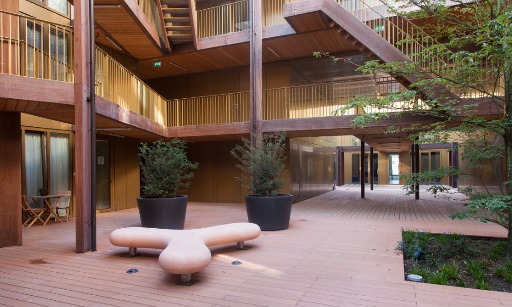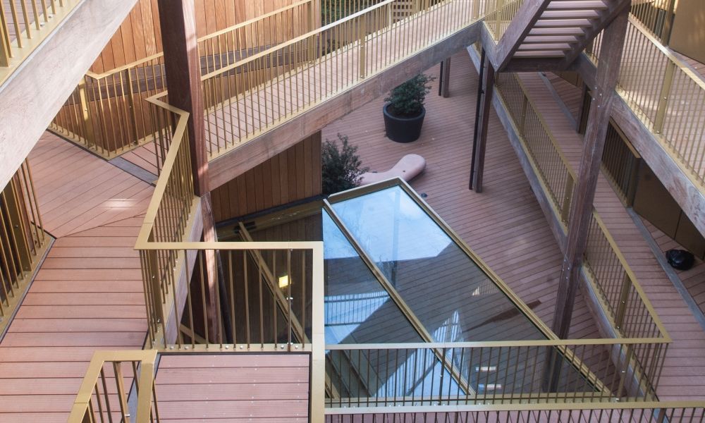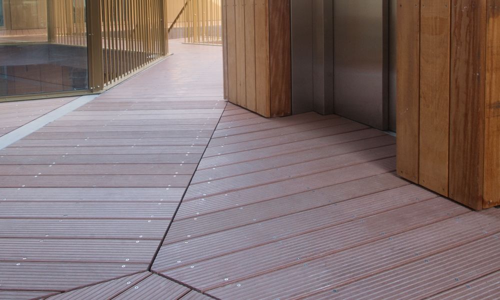 Voor het project Kop van Lombok in Utrecht is gekozen voor Envirodeck profielstrokenbekleding voor op de vloeren en trappen. De profielen behoeven weinig onderhoud, verkleuren vrijwel niet en zijn bovendien brandveilig (Cfl).